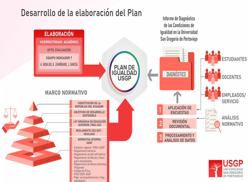 Que, el artículo 10 del Estatuto de la Universidad San Gregorio de Portoviejo, determina: “La planificación institucional en la Universidad San Gregorio de Portoviejo, constituye uno de los aspectos relevantes del proceso educativo, toda vez que tiene por finalidad orientar el desarrollo organizacional, previendo las herramientas necesarias para la dirección, la evaluación y coordinación de la prospectiva institucional”. Que, el artículo 168 del Estatuto de la Universidad San Gregorio de Portoviejo, prevé que: “La Universidad San Gregorio de Portoviejo, garantiza el principio de igualdad de oportunidades, el mismo que consiste en brindar las posibilidades en el acceso, permanencia, movilidad y egreso en la institución sin discriminación de género, credo, orientación sexual, etnia, cultura, preferencia política, y condición socio económica o discapacidad. Así mismo propenderá por los medios a su alcance que, se cumpla a favor de los migrantes el principio de igualdad de oportunidad”. Que, la Disposición General Cuarta del Estatuto de la Universidad San Gregorio de Portoviejo, dice: “La Universidad San Gregorio de Portoviejo elaborará su plan estratégico de desarrollo institucional y planes operativos concebidos a mediano y largo plazo, según sus propias orientaciones. Estos planes contemplaran las acciones en el campo de la investigación científica y establecer la articulación con el Plan Nacional de Ciencia y Tecnología, Innovación y Saberes Ancestrales, y con el Plan Nacional de Desarrollo”. Que, el 09 de febrero de 2026, mediante corre institucional, el equipo de trabajo Indicador 7, integrado por los profesores: Arq. Juan Gabriel García García, Abg. Astrid Alejandra Hidalgo Valverde; y la Lcda. Katerine Zambrano Vélez, presentan ante el Rector de la Universidad San Gregorio de Portoviejo Arq. Jaime Alarcón Zambrano PhD., el Plan de Igualdad de la institución, expresando: “En atención a los compromisos institucionales asumidos y conforme al cronograma establecido, remitimos para su conocimiento y revisión el Plan Institucional de Igualdad de la Universidad San Gregorio de Portoviejo 2025–2029, junto con el Informe de Diagnóstico que sustenta dicho instrumento, elaborado en base a la metodología participativa desarrollada por el equipo de trabajo del Indicador 7. Ambos documentos recogen los principios establecidos en el Reglamento para garantizar la igualdad de todos los actores del sistema de educación superior (CES 2017), se alinean al PEDI 2025–2029, y se estructuran conforme a los requerimientos del modelo de evaluación del CACES. Agradecemos de antemano su atención y quedamos atentos a cualquier observación o disposición adicional…”.
