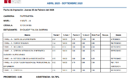 Que, mediante correo electrónico, el día 05 de febrero de 2026, la Licenciada Gloria Elizabeth Solórzano Zambrano, en calidad de Coordinadora de la Carrera de Enfermería, presenta el informe académico de la estudiante Sabrina Shouadif Palma: “ Por medio de la presente, en calidad de Coordinadora de la Carrera de Enfermería, me permito informar que la señorita Sabrina Shouadif Palma, se matriculó en el periodo académico abril – septiembre 2025, presentando con regularidad a las sesiones académicas teóricas – prácticas y examen del primer parcial, durante el segundo parcial acude a clases con normalidad, pero no se presenta a rendir exámenes del segundo parcial. Es de comunicar que la estudiante con fecha 23 de septiembre solicita a través de correo institucional, rendir los exámenes atrasados, se realiza la resolución sin embargo no se presenta tampoco. Es de destacar que las Lic. Tatiana Vinces Sornoza, Lic. Silvia Vinueza Andino, docentes de las cátedras Teorías de la Enfermería y ética y Deontología del profesional de Enfermería, respectivamente, cargan puntajes al sistema de gestión académica, los siguientes: componentes: Aprendizaje en Contacto con el Docente, Aprendizaje Práctico Experimental, Aprendizaje Autónomo, excepto nota de Examen, los mismos que no pudo rendir por falta de pago. Adjunto el reporte de notas y asistencia del sistema de Gestión Académica institucional.