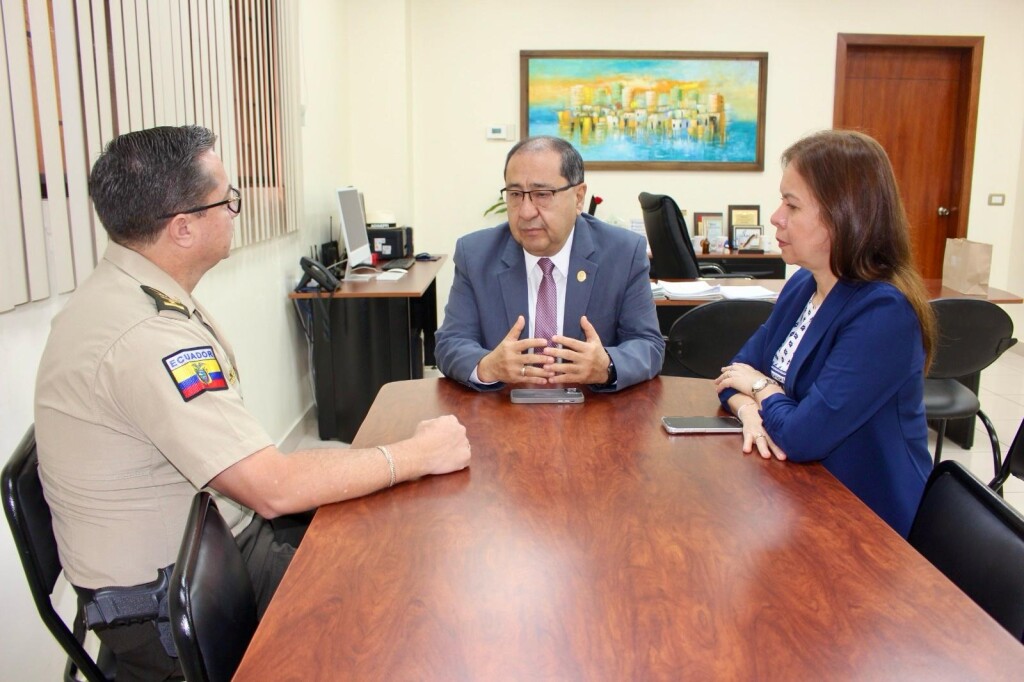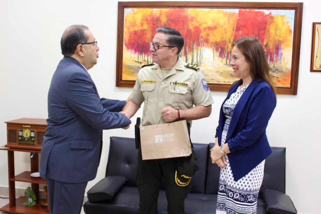 Este encuentro marca un hecho significativo, al ser la USGP el primer centro educativo visitado por el Crnl. Naranjo en el marco de su gestión. Durante su visita, mantuvo una reunión de trabajo con el Dr. Jaime Alarcón Zambrano, Ph.D., Rector de la Universidad, y la Dra. Ximena Guillén Vivas, Ph.D., Canciller, en la que se abordaron temas clave relacionados con la seguridad ciudadana, la protección del entorno universitario y la articulación de esfuerzos conjuntos.